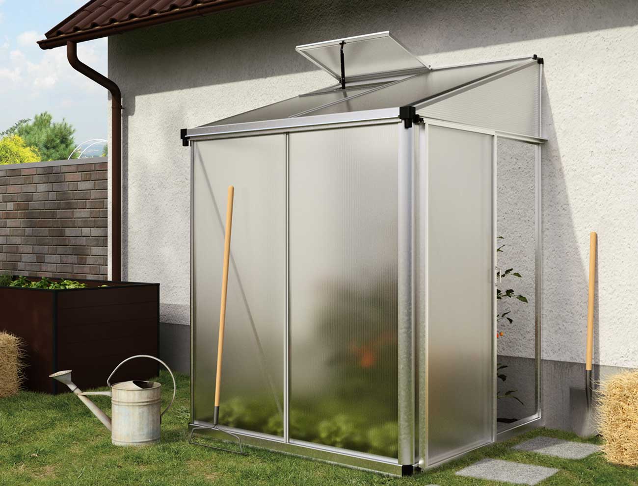 Anlehngewächshaus 159×148 cm, 10 mm, Gewächshaus, Anbaugewächshaus, tomatengewächshaus, tomatenhaus – in Aktion