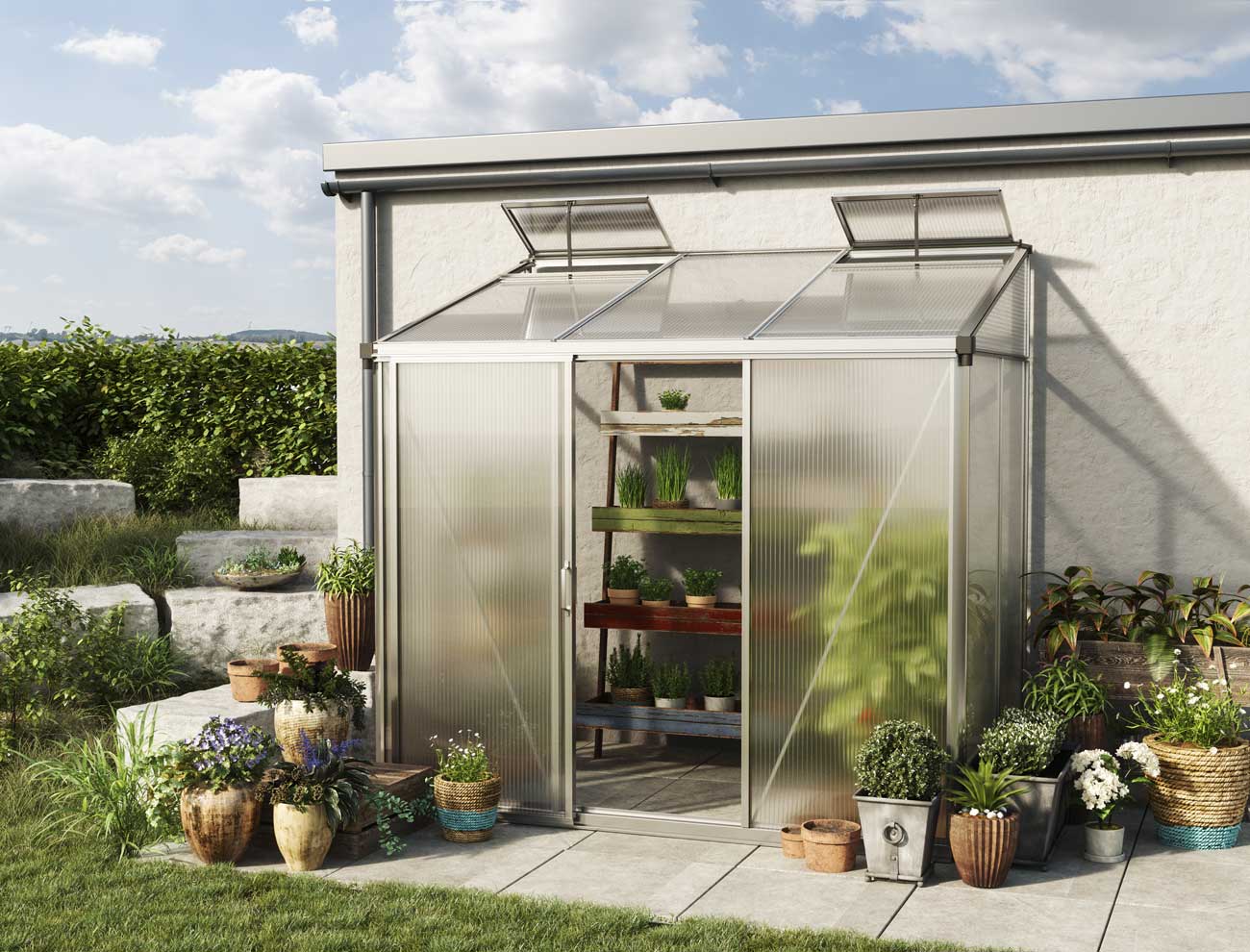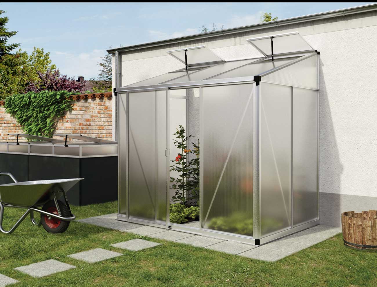Dieses Anlehngewächshaus eignet sich hervorragend für Hobbygärtner, die
