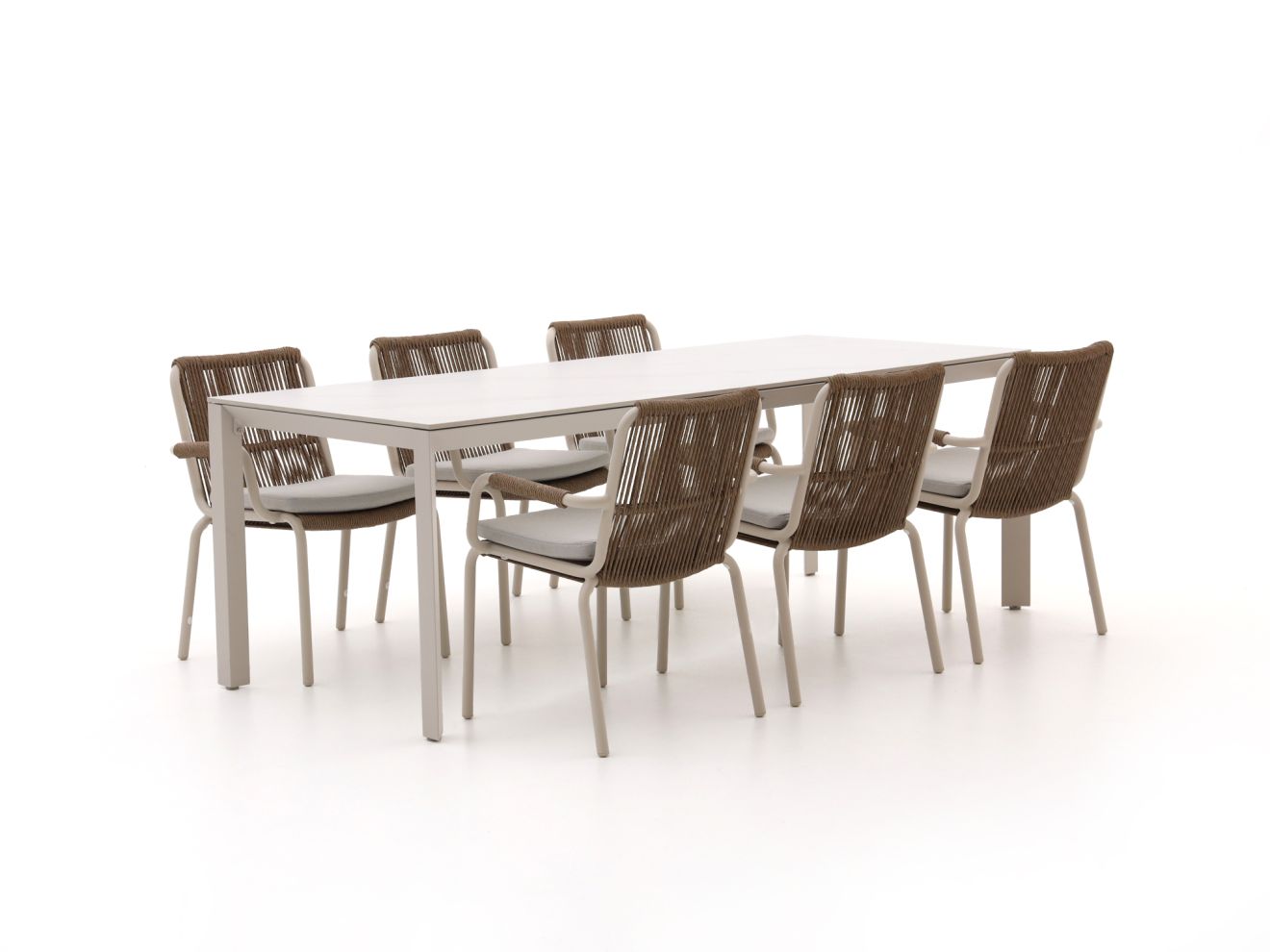 Das Bellagio Caronia/Sestino 220 cm Gartenmöbel-Set 7-teilig bietet eine ideale Kombination aus hochwertiger Verarbeitung, modernes Design und praktischer Funktionalität. Dieses Set ist perfekt auf sechs Personen abgestimmt und verwandelt jeden Garten, jede Terrasse oder Ihren Balkon in einen einladenden Ort für gemeinsame Stunden. Der großzügige Tisch mit einer Oberfläche aus robustem Sintered Stone in Mountain White ist besonders widerstandsfähig gegenüber Kratzern und Witterungseinflüssen. Gleichzeitig ist er pflegeleicht und unkompliziert zu reinigen – ideal für den täglichen Einsatz im Freien.