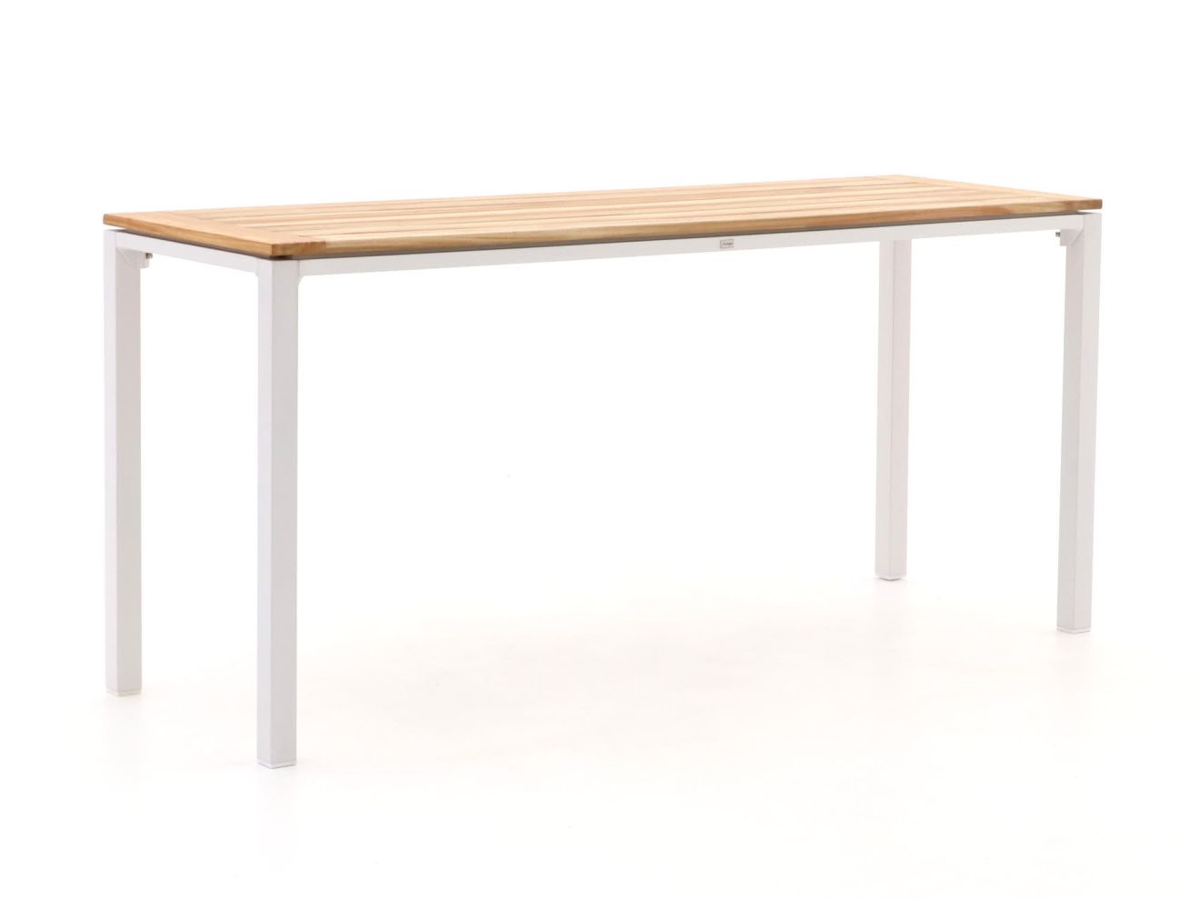 Das Tischblatt zeigt die natürliche Teakholzfarbe, kombiniert mit einem pulverbeschichteten Aluminiumgestell in Weiß-Ecru, was einen ruhigen und modernen Look erzeugt.