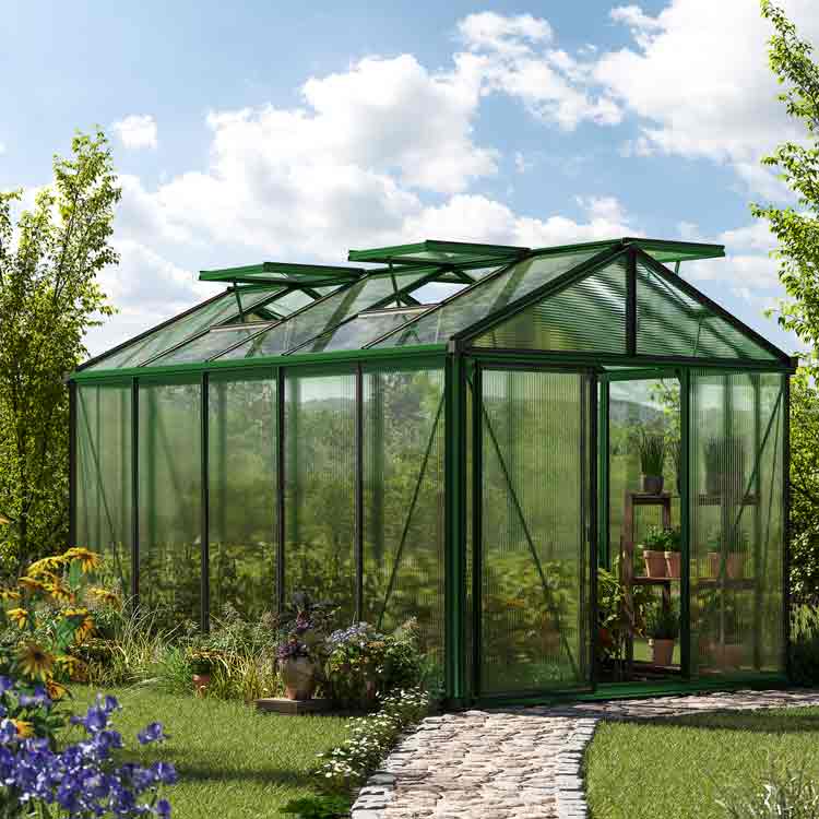 - Das Gewächshaus besteht aus einer stabilen Aluminiumkonstruktion und robusten 10 oder 12 mm starken Polycarbonatplatten, die für optimale Lichtdurchlässigkeit und Langlebigkeit sorgen.