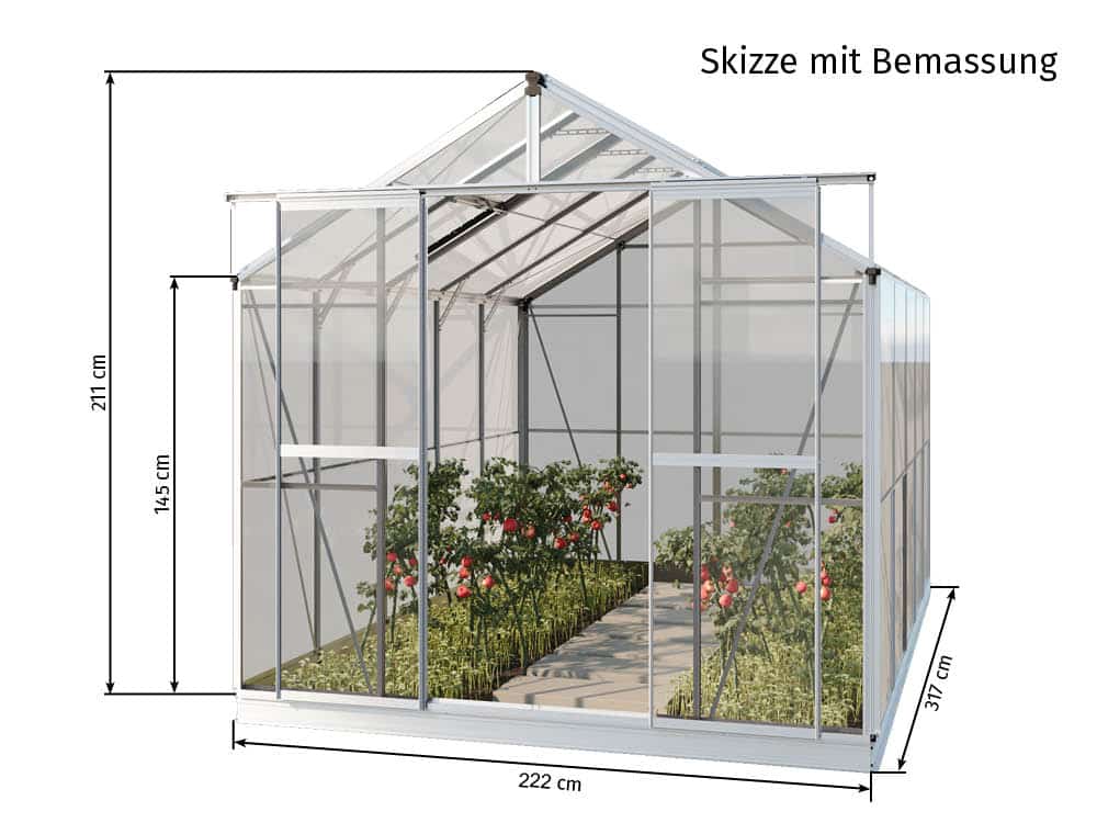 Das Gewächshaus verfügt über eine großzügige Grundfläche von etwa 5 Quadratmetern, die je nach Modellvariante leicht variieren kann. Die extra große Dimension erlaubt es, viele Pflanzen gleichzeitig unterzubringen und bequem darin zu arbeiten.