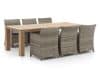 Das Gestell besteht aus rostfreiem Aluminium, die Tischplatte ist in taupefarbenen Naturtönen gehalten und ebenfalls wetterbeständig.